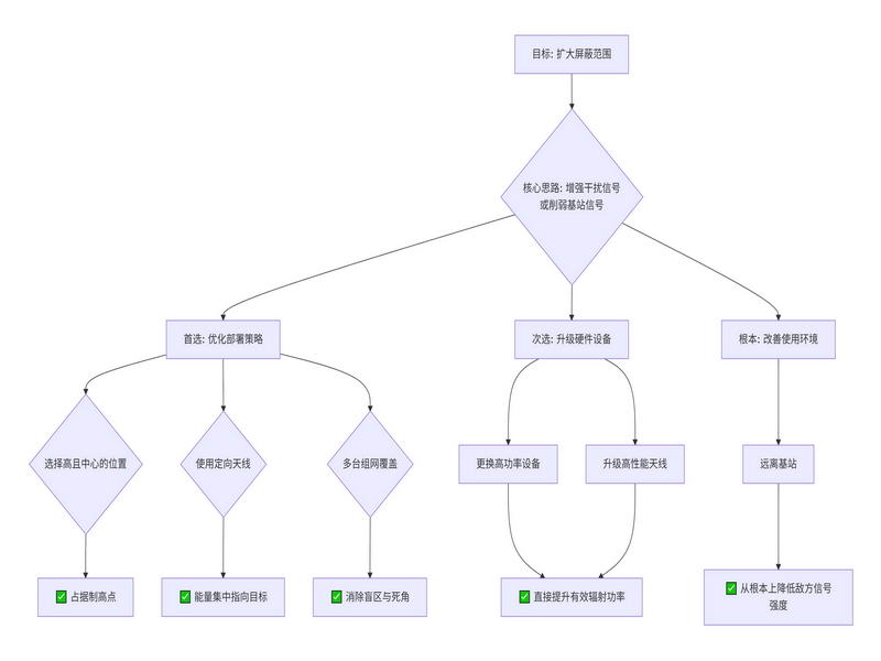 效果:减少障碍物阻挡,使干扰信号能以直线或更短路径覆盖更大范围。